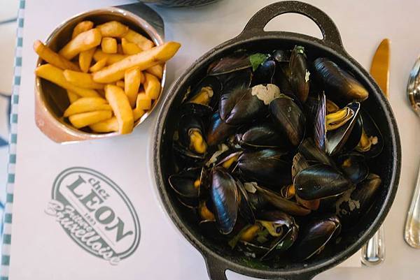 最後晚上到了頗具盛名的淡老店菜Chez Léon,大家總說到比利時千萬錯過鬆餅、巧克力和淡菜,我自己點了一份淡菜鍋,其實分量算滿多的,還加上了一份薯條,整個吃得很飽