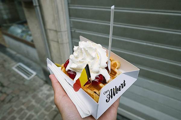 在市集廣場前到城堡廣場的路上有家布魯日小有名的鬆餅店-Chez Albert,我點了一份並加了店員建議的櫻桃醬,個人覺得還不錯